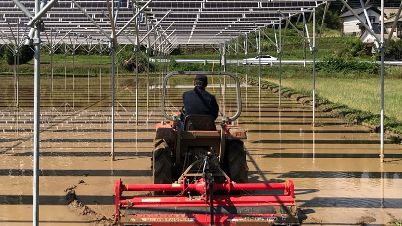 “… 환경성의 추계 ※1 에 의하면, 2050년의 영농형 태양광 발전의 도입 포텐셜은 경지(밭작·벼농사) 770.6GW(설치 가능 면적 환산:약 192.6만 ha), 황폐 농지(재생 이용 가능) 17.5GW ※2 (동:약 4.4만 ha)이며, 이것은 태양광 발전 전체의 도입 포텐셜의 약 54%에 이른다….”