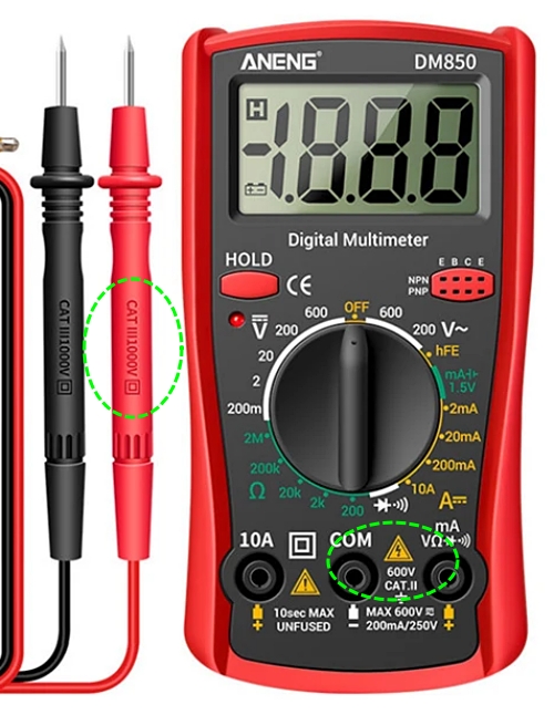 멀티미터 제조사는 반드시 전압 등의 측정 범위와 CAT 등급을 기기 겉면 그리고 프로브 겉면에 표기합니다. 레인지 범위가 넓고 CAT 등급이 올라갈수록 고가의 멀티미터가 됩니다. 만일, CAT 등급 표기가 없다면, CAT 등급 인증을 받지 않았다는 뜻이고 그것은 그 멀티미터가 싸구려라는 뜻이며, 초고압 위험에 고스란히 노출된다는 의미이기 때문에 쓰지 않는 것이 좋습니다.