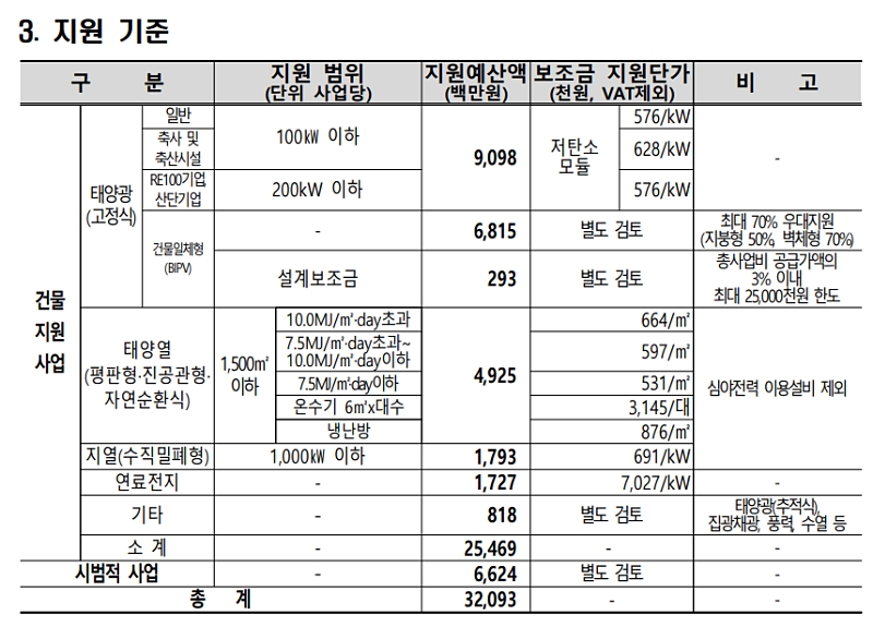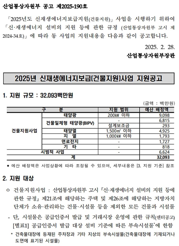 건물지원사업 : 산업통상자원부 고시『신·재생에너지 설비의 지원등에관한 규정』제21조에 해당하는 주택 및 제26조에 해당하는 지방자치단체가 소유·관리하는 건물·시설물 등을 제외한 모든 건물과시설물- 단, 시설물은 공급인증서 발급 및 거래시장 운영에 관한 규칙(센터공고) [별표1] 공급인증서 발급 대상 설비 기준에 따른 부속시설물*에한함 * 건축물대장에 등재된 주차장과 기타 지상의 부속시설물(건축물대장에 기재되거나 도면에 표기된 시설물)