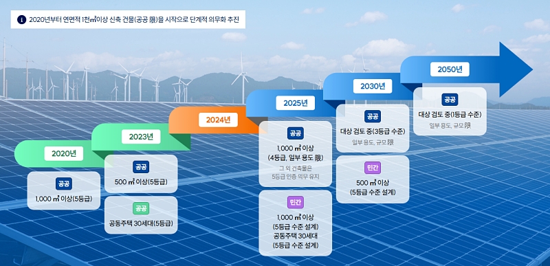 녹색건축물 조성 지원법 및 시행령, 제로에너지건축물 인증에 관한 규칙, 제로에너지건축물 인증 기준 등에 의거하여, 앞으로는 특정 조건의 민간 건물도 <제로에너지인증(ZEB, Zero Energy Building)>을 받아야 합니다. 2025년 6월부터 1000㎥ 이상 건물에 적용하는 등 점진적으로 국가의 에너지 관리 정책이 강화되고 있습니다.