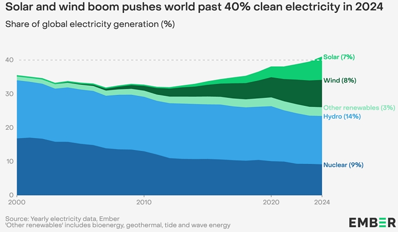 청정 에너지, 전 세계 전력 생산량의 40% 돌파