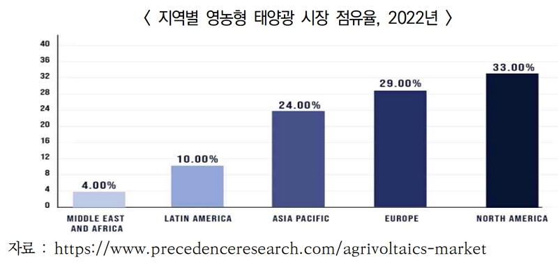 전 세계 영농형 태양광 설비의 보급실적은 2012년 5MW에 불과했지만, 2018년 2.9GW, 2021년 14GW로 빠르게 증가하는 추세를 보임. 2022년 기준 영농형 태양광 시장은 농업기술 발전과 첨단기계의 보급에 힘입어 북미 지역이 가장 큰 비중을 점유하고 있으며, 유럽과 아・태 지역이 뒤따르고 있음.