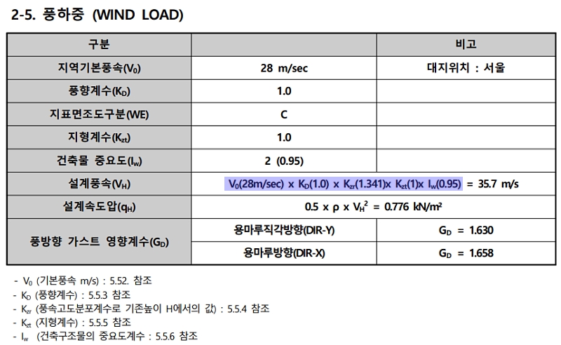 아래와 같이 KS 규격으로 정해진 지역기본풍속과, 구조물 형상 및 사용 재질에 기반하는 가스트 영향 계수(Gust Effect Factor)과 기타 공학적 변수를 곱하여 풍하중을 계산하고, 그것이 목표하는 설계 기준을 만족하는지를 평가합니다.